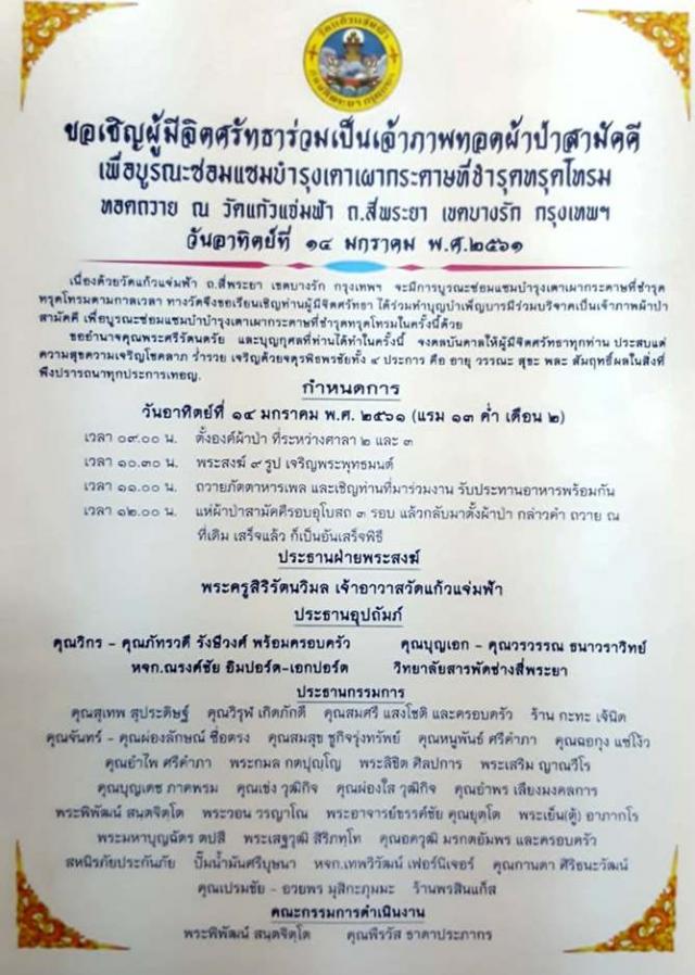 ขอเชิญผู้มีจิตรศรัทธาร่วมเป็นเจ้าภาพทอดผ้าป่าสามัคคี เพื่อบูรณะซ่อมแซมบำรุงเตาเผากระดาษที่ชำรุดทรุดโทรม ทอดถวาย ณ วัดแก้วแจ่มฟ้า ถ.สี่พระยา เขตบางรัก กรุงเทพฯ ในวันอาทิตย์ที่ 14 มกราคม พ.ศ.2561